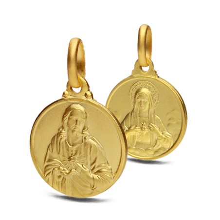 Złoty medalik dwustronny Serce Jezusa i Serce Maryi to elegancki i pełen duchowego znaczenia medalik wykonany z najwyższej jakości złota próby 585. Dwustronny wzór łączy dwa najważniejsze symbole katolickiej duchowości – Najświętsze Serce Jezusa oraz Niepokalane Serce Maryi, tworząc wyjątkowy znak wiary, miłości i zawierzenia Bożej Opatrzności.